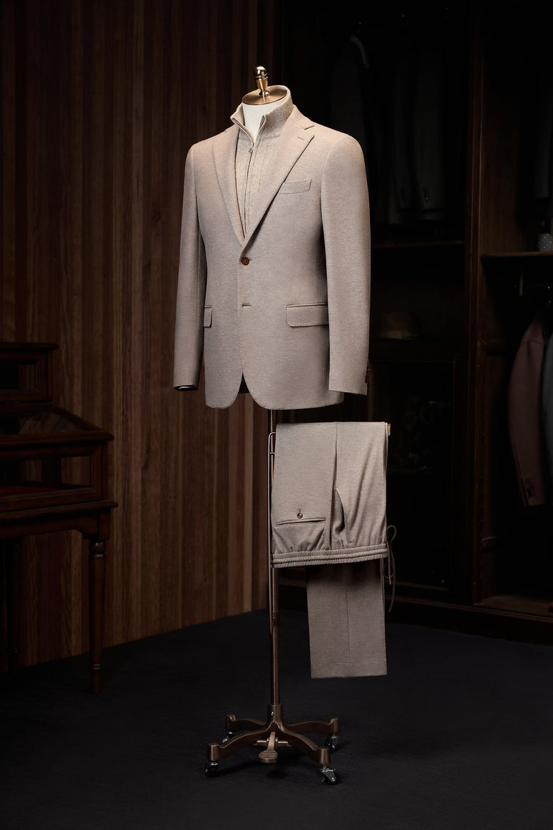 This light grey suit exudes understated elegance, crafted for those who appreciate a blend of luxury and comfort. The soft, tailored jacket offers a clean silhouette, while the subtle texture adds depth to the overall look. Paired with matching trousers, this ensemble is perfect for both formal and smart-casual settings. Layered with a high-neck knit for added warmth and style, this outfit delivers a contemporary twist on classic tailoring. Whether for business or a sophisticated evening, this combination is designed to keep you looking sharp and feeling comfortable.